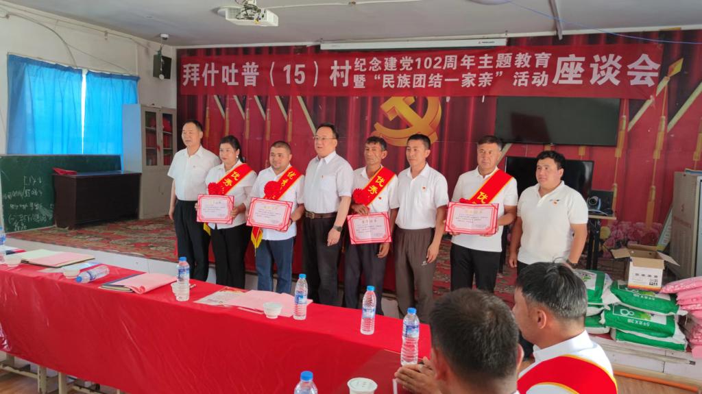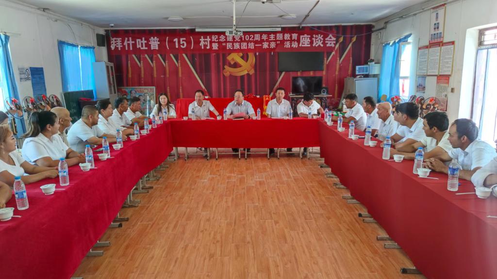 7月1日,在中国共产党建党102周年之际,新疆畜牧科学院驻色力布亚镇拜什吐普(15)村“访惠聚”工作队新、老第一书记共同组织工作队、村“两委”、党员代表开展了“纪念建党102周年”主题教育暨“民族团结一家亲”座谈会。