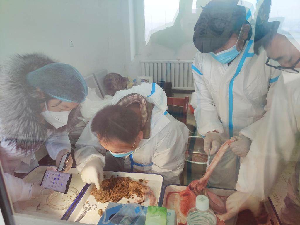 目前正是冬季,是寄生虫感染最容易造成羊只损失的季节。为顺利越冬,大量虫体寄生于羊体内吸食血液、夺取营养,进而造成春季羊只轻则生长缓慢、营养不良;重则消瘦、拉稀、流产,甚至导致衰竭、死亡,而且羊只被寄生虫感染后,身体抵抗力降低,更容易发生细菌、病毒病的感染,从而造成更大的经济损失,因此,及时开展寄生虫病防控工作对保障养殖户经济效益尤为重要。为了解巩乃斯种羊场羊只感染寄生虫情况,避免造成春季损失,专家组借新疆细毛羊种质资源普查和品种鉴定之际,对巩乃斯种羊场饲养的新疆细毛羊进行了消化道寄生虫的检查,共屠宰剖检30只羊,分别采集羊只的内脏(肺,肝,胆,胃,肠)进行检查、计数、鉴定。在向巩乃斯种羊场反应了检测结果,汇报羊只感染情况,展示了采集的虫体的同时,专家组根据实际情况有针对性的提供了“冬季驱虫+精准驱虫”新的驱虫解决办法,助力羊场有效提高寄生虫病防控能力。