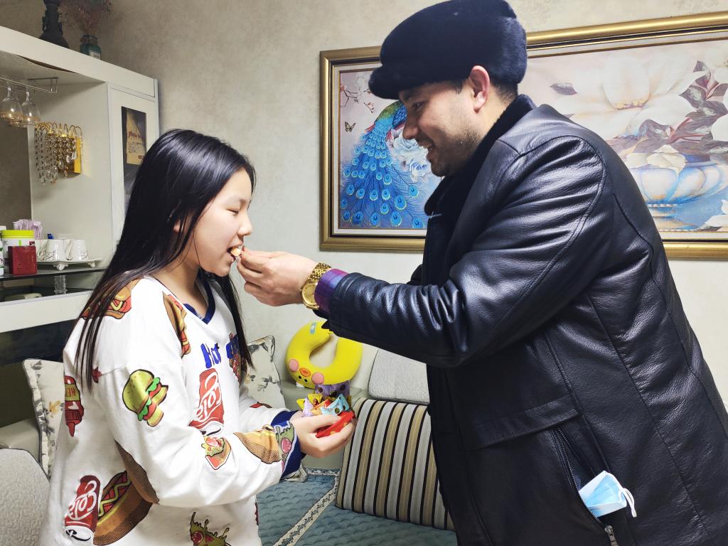 春节前夕,在得知克尤木·阿布都热西提从巴楚县色力布亚镇阿勒台开斯克(12)村到乌鲁木齐看病后,刘娜娜第一时间与他联系,了解病情及治疗情况,并主动邀请其到家里做客,克尤木·阿布都热西提很激动也很开心,在看到刘娜娜的女儿从小到大不同时期可爱的照片和全家福时,不停的夸赞,并主动给小朋友送上了糖果和祝福,希望小朋友能学习进步,健康快乐成长。