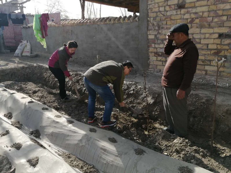 三月的色力布亚镇杨柳吐绿,杏花飘香,结亲干部帮助亲戚搭建蔬菜大棚,整理菜园,修葺田埂,与亲戚一起栽种果苗。兽医研究所结亲干部苗书魁、汪晓红和刘帅在15村入户时,遇到汪晓红的联系户艾尼瓦尔·卡生木正在院内栽种果树苗。艾尼瓦尔看到自己的亲戚进院里了,马上放下锄头要为亲戚们准备茶水。苗书魁赶快拦住他并拿起了艾尼瓦尔刚放下的锄头说:“一年之计在于春,我们来就是帮你们干活的,我们一起种下团结树,会得结亲果”。艾尼瓦尔·卡生木听了眯着眼睛憨憨一笑的说:“结亲干部每次到我家来,都帮我们干活,感谢政府给我们结的好亲戚,等结果子了,你们不但要来我家吃果子,还要带回去给你们的家人也尝尝”。艾尼瓦尔·卡生木和三位结亲干部边聊家常边干活,因为有了结亲干部的帮助,一会儿的时间,便栽好了树苗,浇好了水。三位结亲干部还帮助亲戚整理菜园,给大棚里的蔬菜浇水。艾尼瓦尔·卡生木说:“我的院子里不但要种果树,我还要把这些菜种好,让你们每次来都有绿色的蔬菜吃。”苗书魁说:“自己动手丰衣足食,勤劳才能致富。希望我们每次来都能看到新变化,希望你们的生活过得越来越好,日子越来越红火。村里的每个农民都转变思想,努力挣钱把日子过好,我们的国家才能越来越好”。