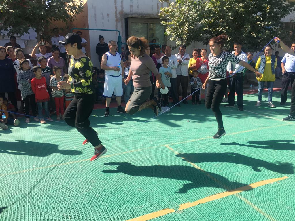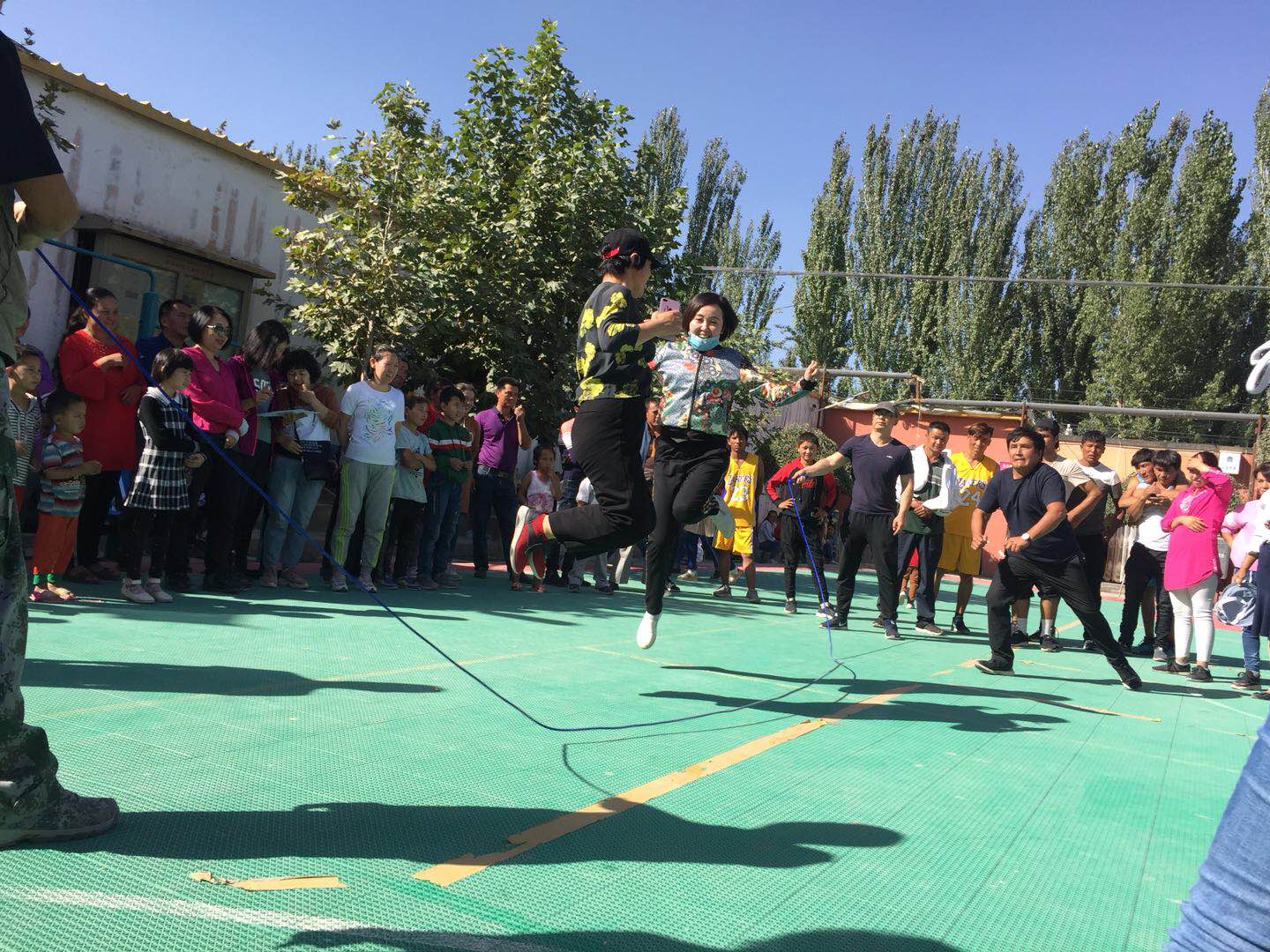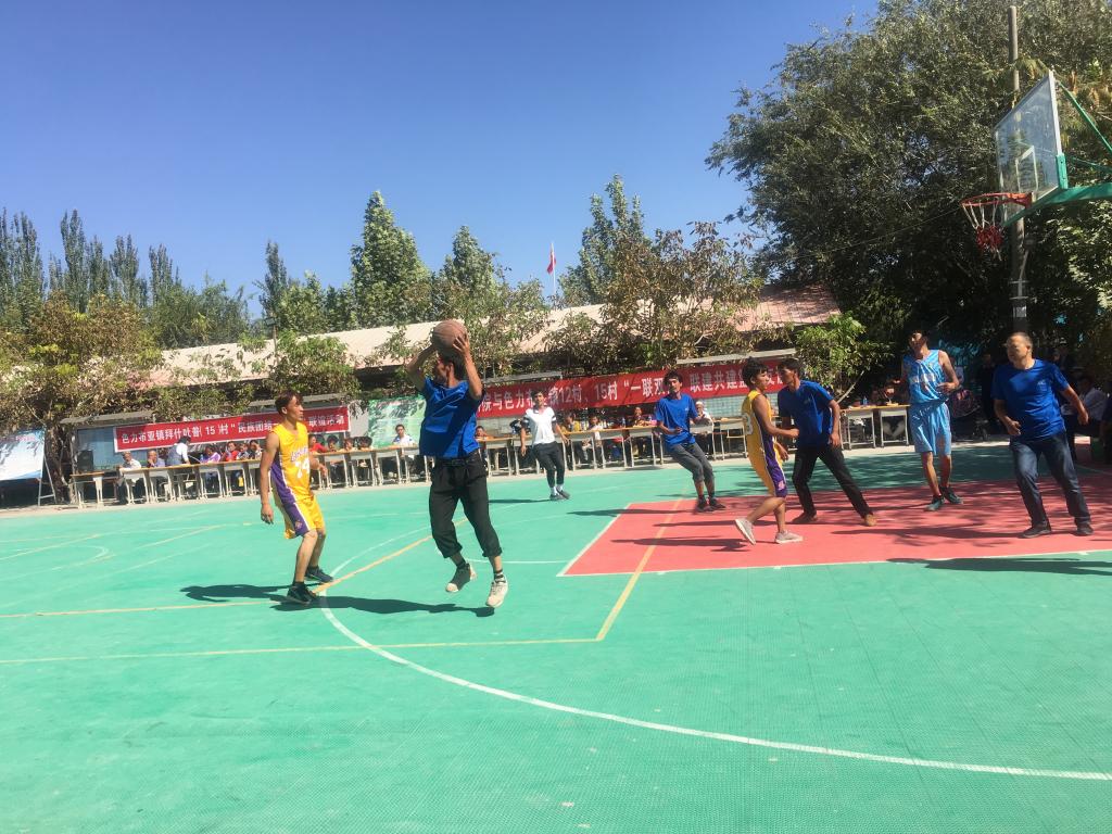 中午,院办公室副主任朱琴组织结亲干部和村民在15村村委会篮球场布置桌椅,摆上各种各样的零食和月饼,新疆畜牧科学院党委委员、副院长、院“访惠聚”工作队领队郑文新同志向参加活动的结亲干部和村民代表表达了节日的祝福。中午1点半,郑文新副院长宣布篮球赛、跳绳比赛正式开始,比赛由15村驻村工作队副队长张学根担任裁判,色力布亚镇12村、15村村民和结亲队员分别分成三组进行淘汰赛。比赛中,参赛人员快速奔跑在篮球场上,带球、传球、投篮,熟练而敏捷,大家挥洒着汗水、浇灌着友谊,经过几轮比赛,最终12村夺得冠军。篮球比赛结束后,紧接着是女同志们的跳绳活动,一个结亲队员和两个村民一组,大家齐心协力,步调一致,矫健的身姿在阳光下跳跃,红扑扑的面颊上透露着幸福和谐的民族团结之情。比赛结束,各组按跳绳个数分发奖品,最后所有参赛队员人人都有礼品,一支口红和一条小方巾,礼轻情意重,拿到礼物的队员们露出欣喜的笑脸。