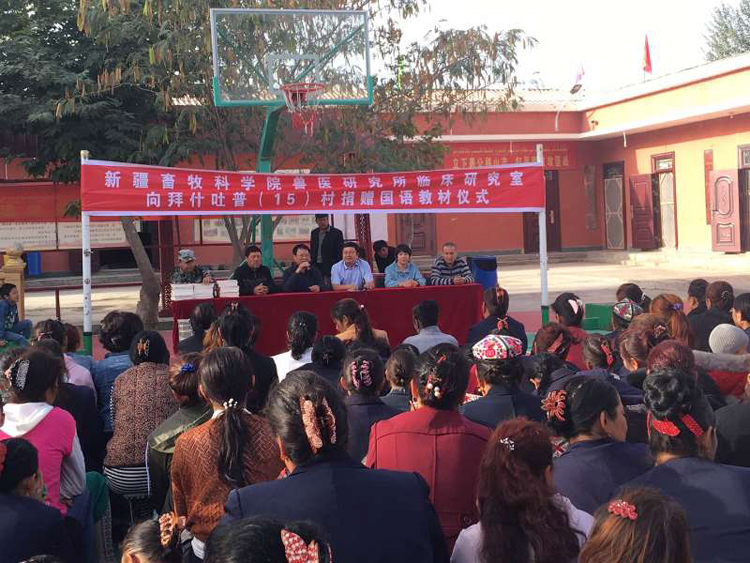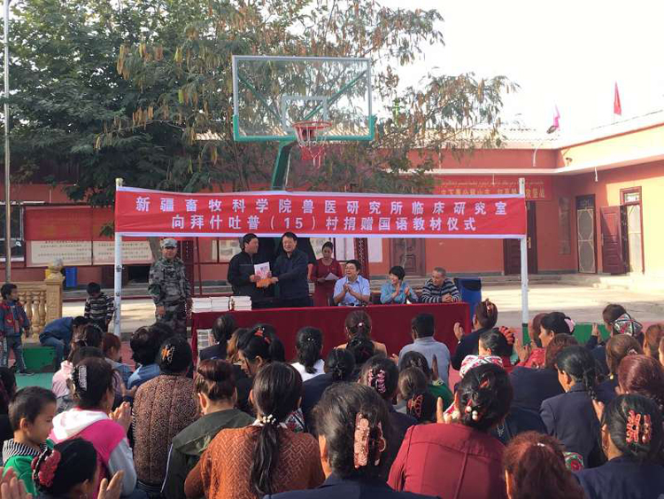 9月24日,参加新疆畜牧科学院第五轮第二批“民族团结一家亲”结亲周活动的兽医研究所结亲干部在拜什吐普(15)村开展了捐赠国语教材活动。