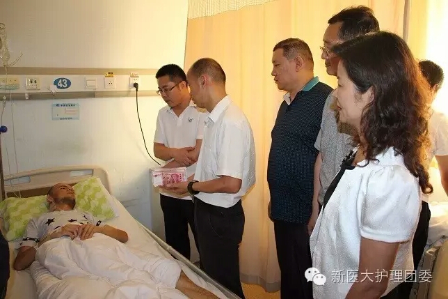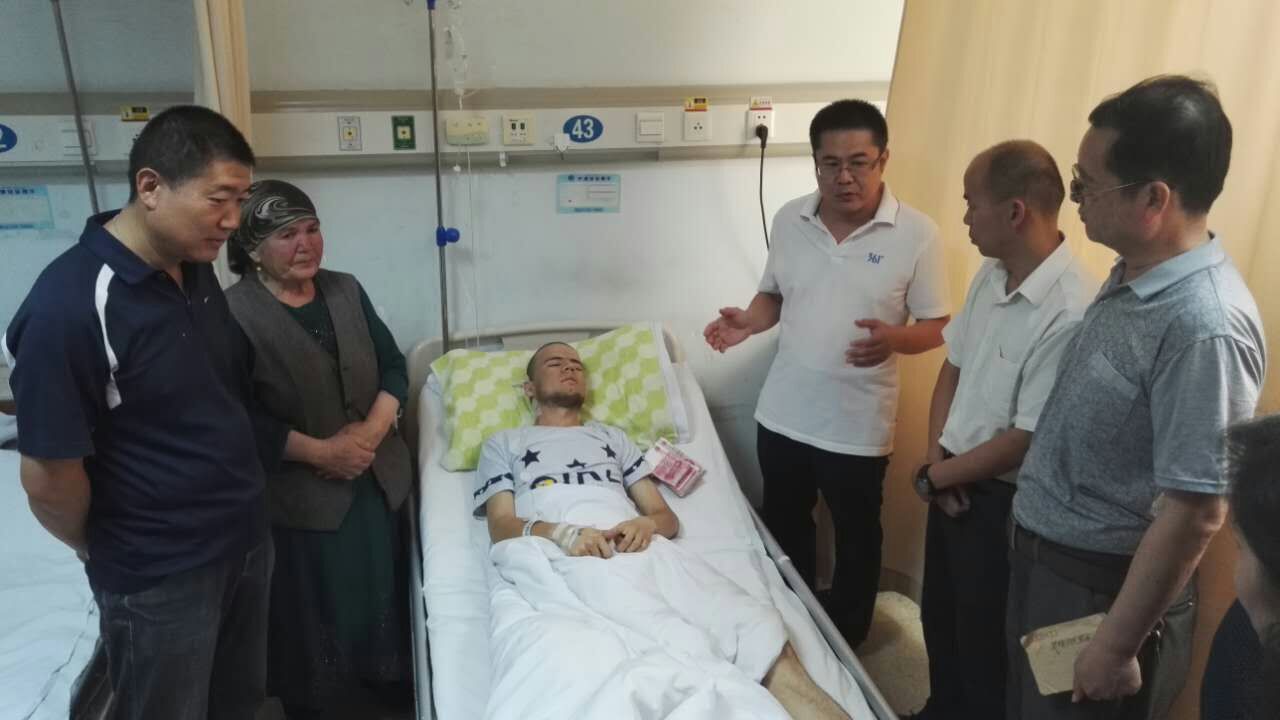 7月11日中午,自治区畜牧厅“访惠聚”工作队的代表专程来到新疆医科大学一附院,看望乃比·卡迪尔同学,并转交了爱心捐款。他66岁的姥姥已泣不成声,对着前来探望的人们连连鞠躬表谢:“热合买提,热合买提,大家救了我孩子的命,我和孩子一辈子忘不了你们的好!”