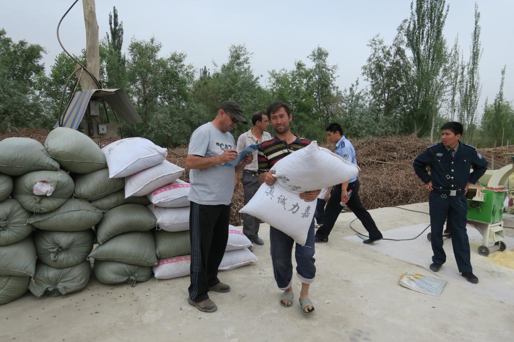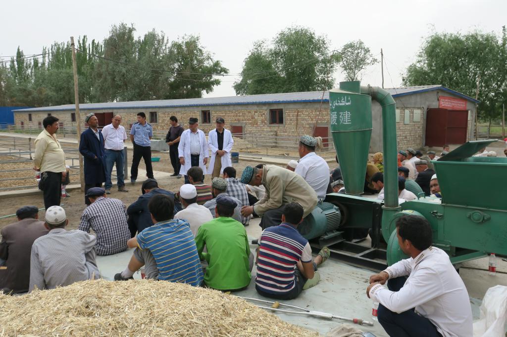 现场会设立了两个观摩点。一户是农民按传统的家庭方式养殖,饲草料加工和饲喂方式简单,成本较低,管理粗放。另一户是合作社规模养殖方式,棚圈等养殖设施比较先进,饲料加工设备比较齐全,防疫、饲养管理的水平比较高。结合当地的饲草料资源、加工设备和绵羊品种的特性,住村工作组的专家的使用平实,简浅的语言给养殖户传授了饲养管理技术,饲草料配制技术,杂交改良技术,疫病防治技术等科学养羊方面的知识。为参加培训的村民分发了3.2吨苜蓿草颗粒饲料和维语版的《肉用羊高效育肥技术手册》和《羊病防治手册》。