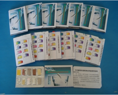 2.技术要点:将试纸浸入被检奶液中,沾取奶液,并立即取出观察试纸的颜色变化。正常乳试纸条不变色。掺过氧化氢乳试纸由白色变为浅蓝色或蓝紫色,如中掺入的过氧化氢量越大,试纸的颜色越深。因为过氧化氢具有强烈的氧化性,它能把碘化钾中的碘离子氧化成碘,由于碘遇淀粉变成蓝色,以此可以快速检出加入过氧化氢的奶样。