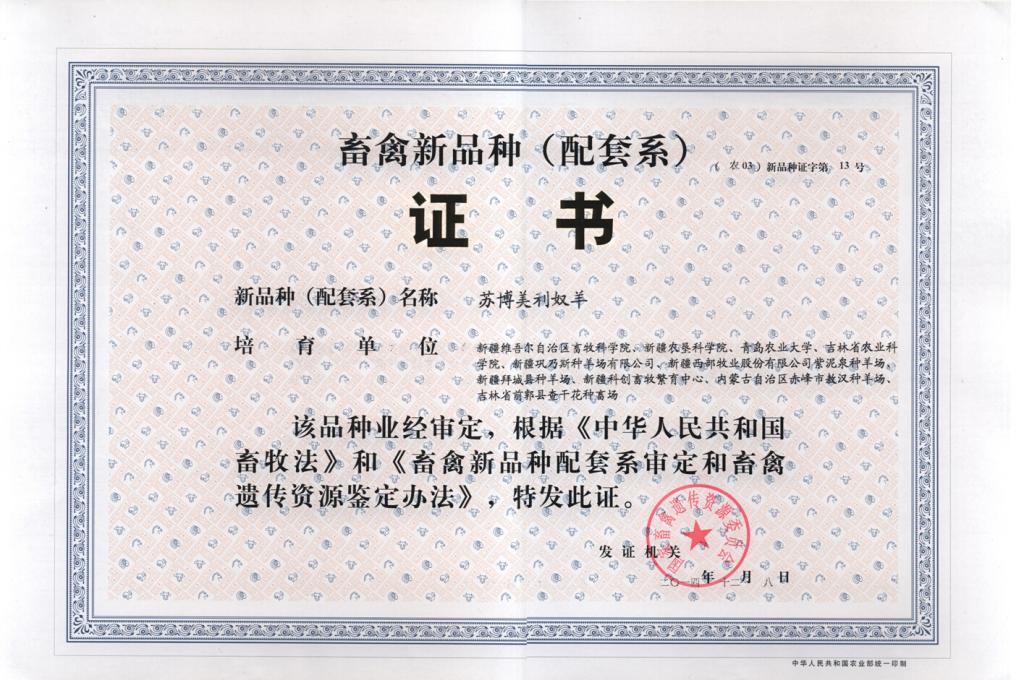 审定情况:2014年通过国家畜禽遗传资源委员会审定,被国家农业部命名为“苏博美利奴羊”。