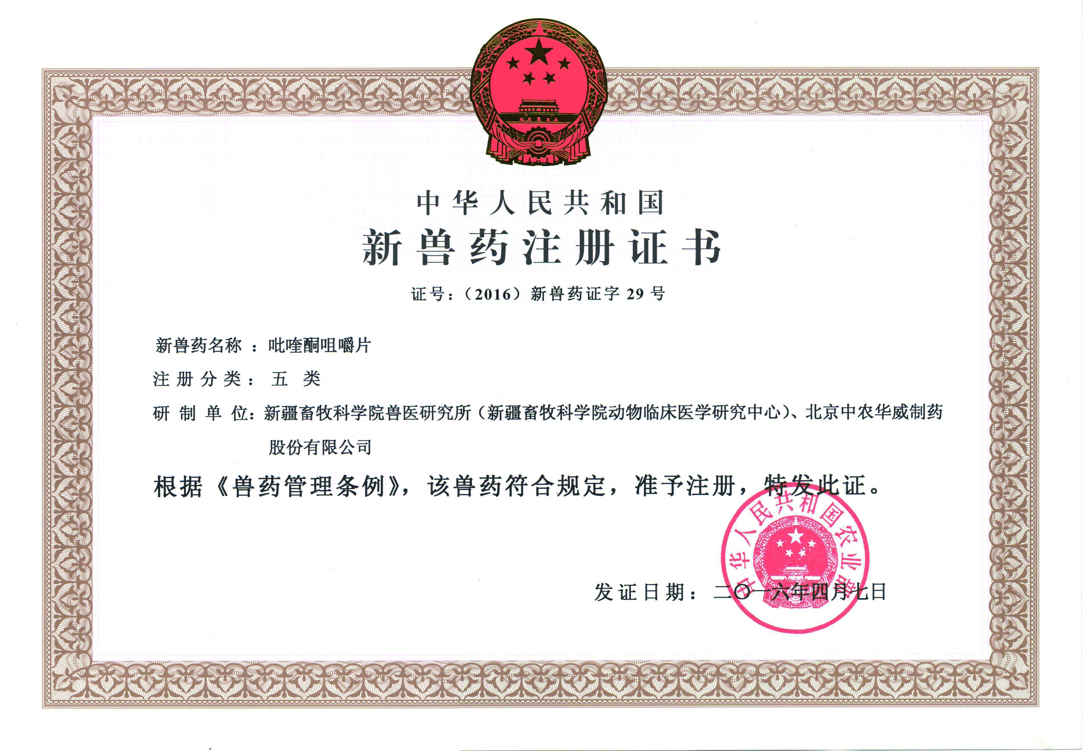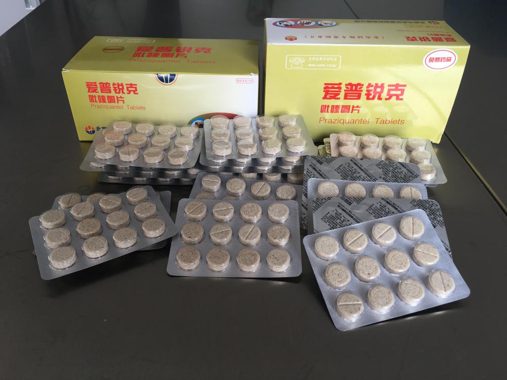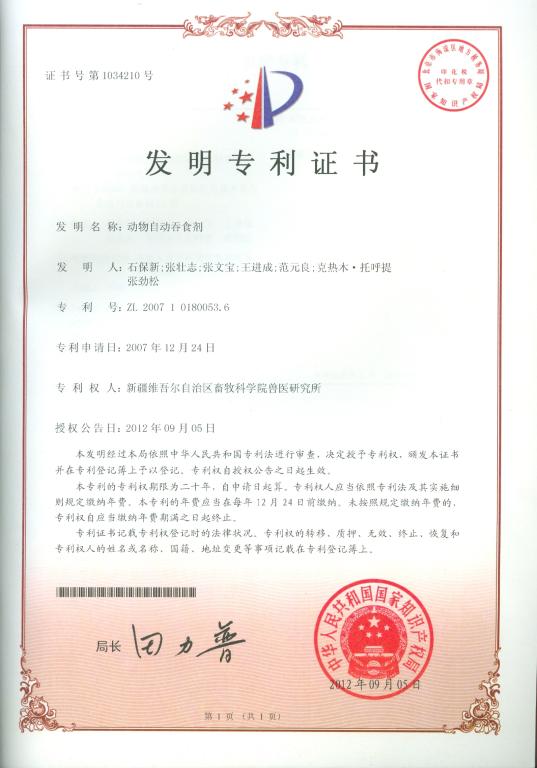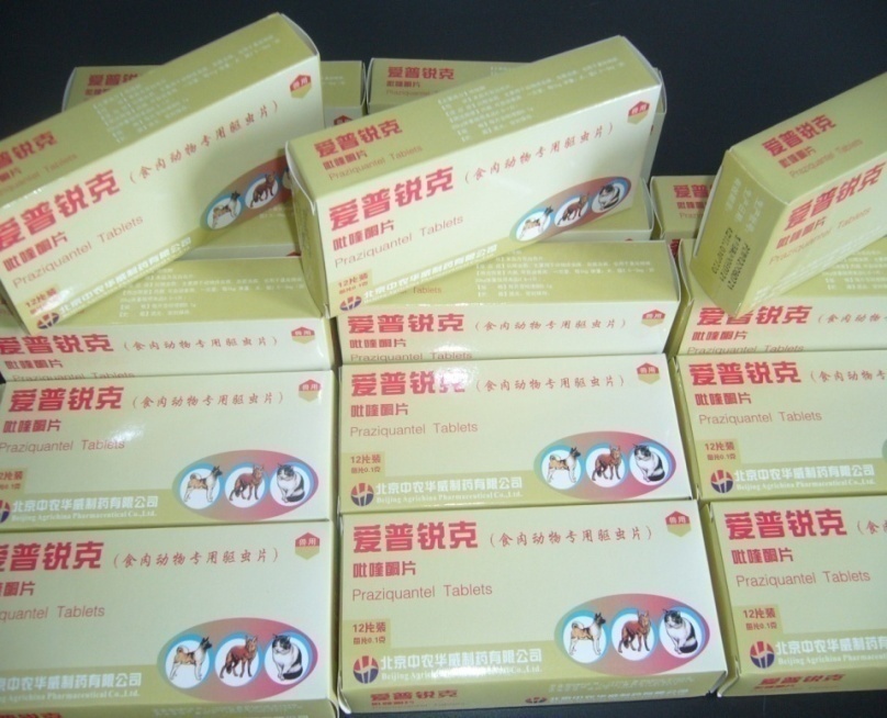 爱普锐克-食肉动物吞食专用吡喹酮片获得国家发明专利,并获得新兽药注册证书【(2016)新兽药证书29号】,农业部给予兽药生产批准文号【兽药字(20160100129074)】。吡喹酮是国际公认的驱除棘球绦虫首选药物,该驱虫药给犬一次服用即可达到100%的驱虫率。但其味苦,普通吡喹酮药片不能掩盖自身的苦味,家/牧犬等食肉动物嗅觉十分敏感,不能主动咀嚼吞食该药片。利用高分子成膜材料将吡喹酮包裹,形成大小以微米或纳米计的微粒,掩盖了吡喹酮不良气味。通过对犬等食肉动物喜食食品和具备符合国家或国际许可饲料添加的动物蛋白制品,经过大量的配方摸索,设计出易取、价廉、符合市场需求的诱食剂配方,但其又不影响原药药效,依此新疆畜牧科学院研制出“爱普锐克-食肉动物自动吞食专用吡喹酮片”旨在解决家、牧犬投药难的问题。同时,可极大地降低防疫人员对传染源(家/牧犬)投药的难度和工作强度,同时又确保了对家/牧犬驱虫密度,是我国包虫病综合防治措施中控制传染源的最有力的技术支撑。