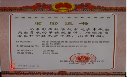 2.生产情况:目前已已中试生产500万毫升,在我区4个地州150万只中进行了防治试验,取得了良好的经济效益和社会效益。