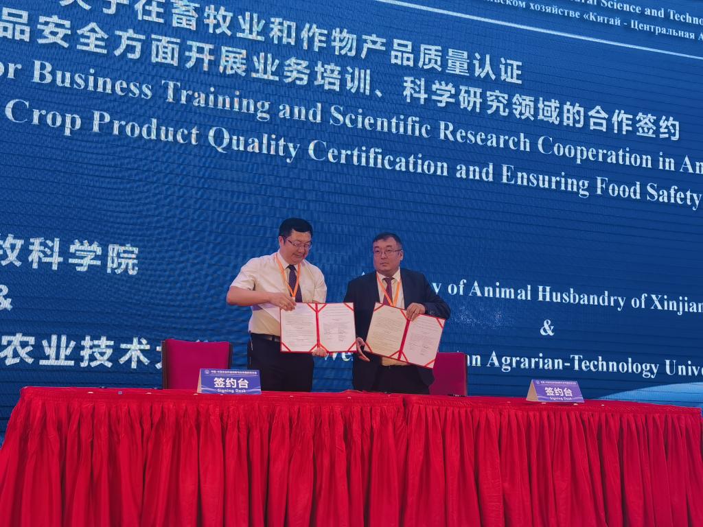 其中,西哈萨克斯坦农业技术大学代表分别与新疆畜牧科学院、新疆畜牧科学院畜牧业质量标准研究所代表签署了《关于在畜牧业和作物产品质量认证以及确保食品安全方面开展业务培训、科学研究领域的合作协议》。根据协议,中哈双方将在畜牧业科技人员培训、动植物遗传资源保护利用、家养动物与牧草育种、畜牧业标准化生产管理、食品安全检测技术、实验室质量控制、动植物产品评估等方面开展长期深入合作,相互协助,共同进步。