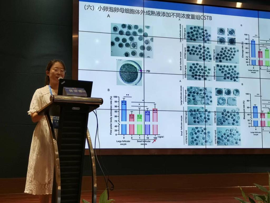 7月16日上午,汪立芹研究员在主会场作了题为《绵羊体外胚胎生产关键技术研究和规模化应用》的大会报告,从绵羊卵母细胞采集、体外胚胎发育、体外胚胎冷冻、体外胚胎高效利用、胚胎生产和冷冻系列试剂的研发等方面全面介绍了团队对体外胚胎规模化生产各个环节的优化与改进,展示了多年来团队在国内其他省市及南北疆各地的应用推广成果。报告内容丰富且十分接地气,获得了参会各界同行的一致认可与好评。会后,与会人员与汪立芹研究员就报告内容展开了深入的学术交流,大家探讨了解决生产中亟待突破瓶颈问题的成功经验,也碰撞出了很多新的研究思路与灵感。团队还准备了自主研发的绵羊体外胚胎培养配套液体,免费赠予其他相关研究单位,以期更好地交流学习,获得了良好反响。此次会议选定了28名优秀的青年后辈在大会的硕博论坛开展学术汇报与交流,团队中陈莹博士在硕博分会场进行了相关研究内容的汇报展示。