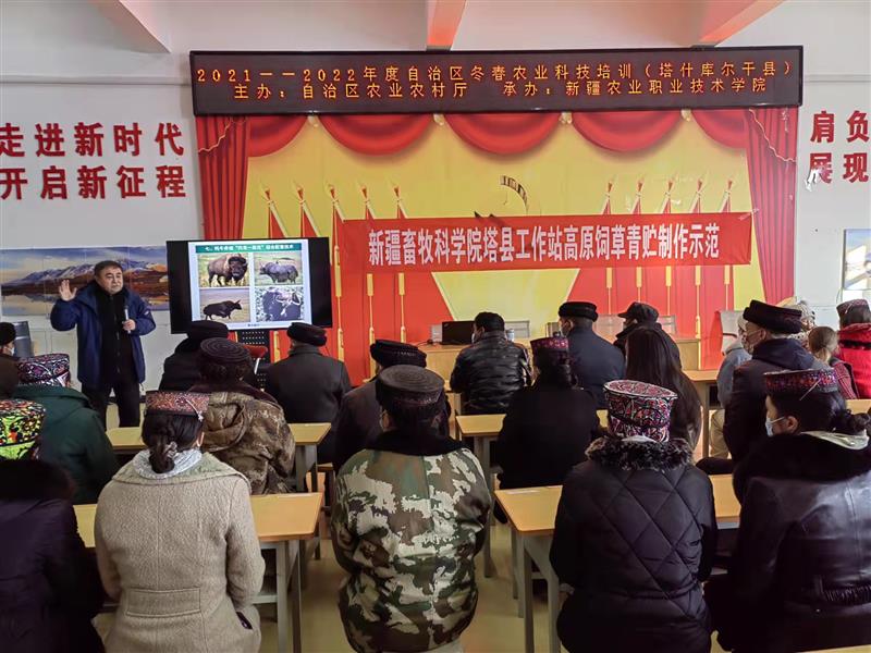 为进一步提升新疆南疆地区畜牧业高质量发展,全面助力乡村振兴,2021年12月14日至2022年1月9日,由新疆维吾尔自治区农业农村厅主办,新疆农业职业技术学院承办的2021—2022年度自治区冬春农业科技专题培训在新疆南疆喀什地区4县1市(喀什市、疏勒县、疏附县、塔什库尔干县、英吉沙县)、克孜勒苏柯尔克孜自治州2县1市(阿图什市、阿克陶县、乌恰县)举办。地州各县市乡镇农牧业技术人员、村级畜牧兽医技术人员、动物村级防疫员、新型农牧业经营和服务主体经营者、种养大户、自治区在喀什地区和克孜勒苏柯尔克孜自治州驻村“访惠聚”工作队的各类技术人员和农牧民群众共计5000余人参加了此次专题培训。