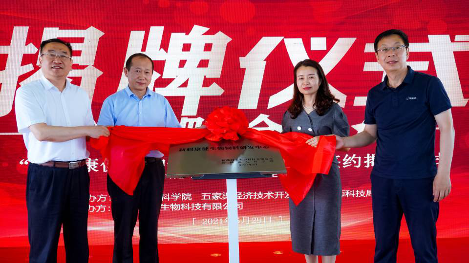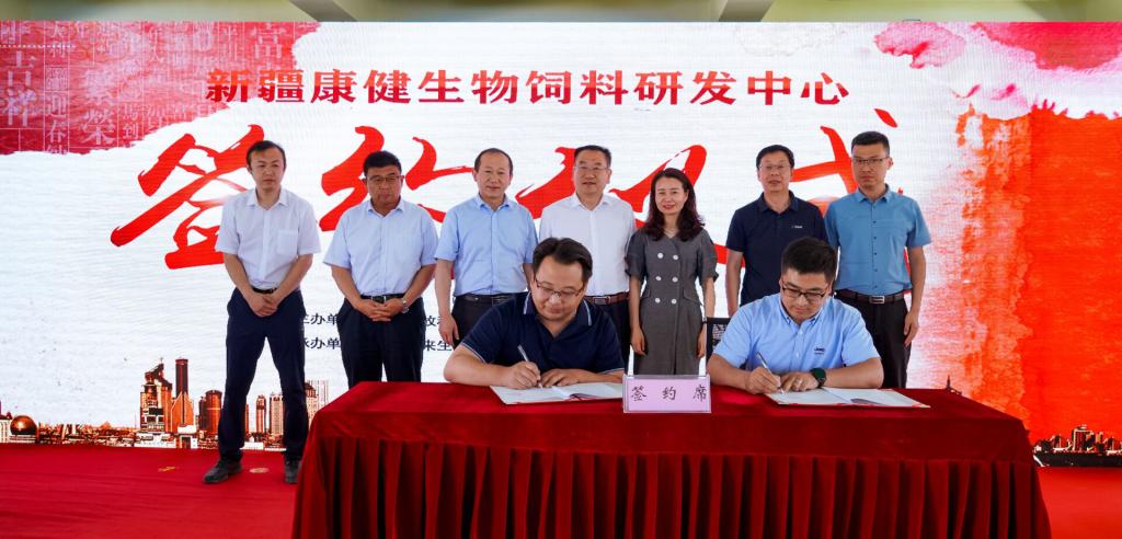 2021年5月29日,新疆畜牧科学院饲料研究所与新疆润来生物科技有限公司共同组建的“新疆康健生物饲料研发中心”正式成立并举行签约挂牌仪式。自治区畜牧兽医局党组成员,畜牧科学院党委书记、副院长冯东河为签约挂牌仪式致辞并与润来公司董事长苗丽华、兵团农业局党组成员杨勇、新疆饲料工业协会会长陈如春共同为研发中心揭牌。院科管处处长高维明、饲料研究所副所长郭同军、研究员王文奇(研发中心副主任)、副研究员张志军出席了签约仪式。
