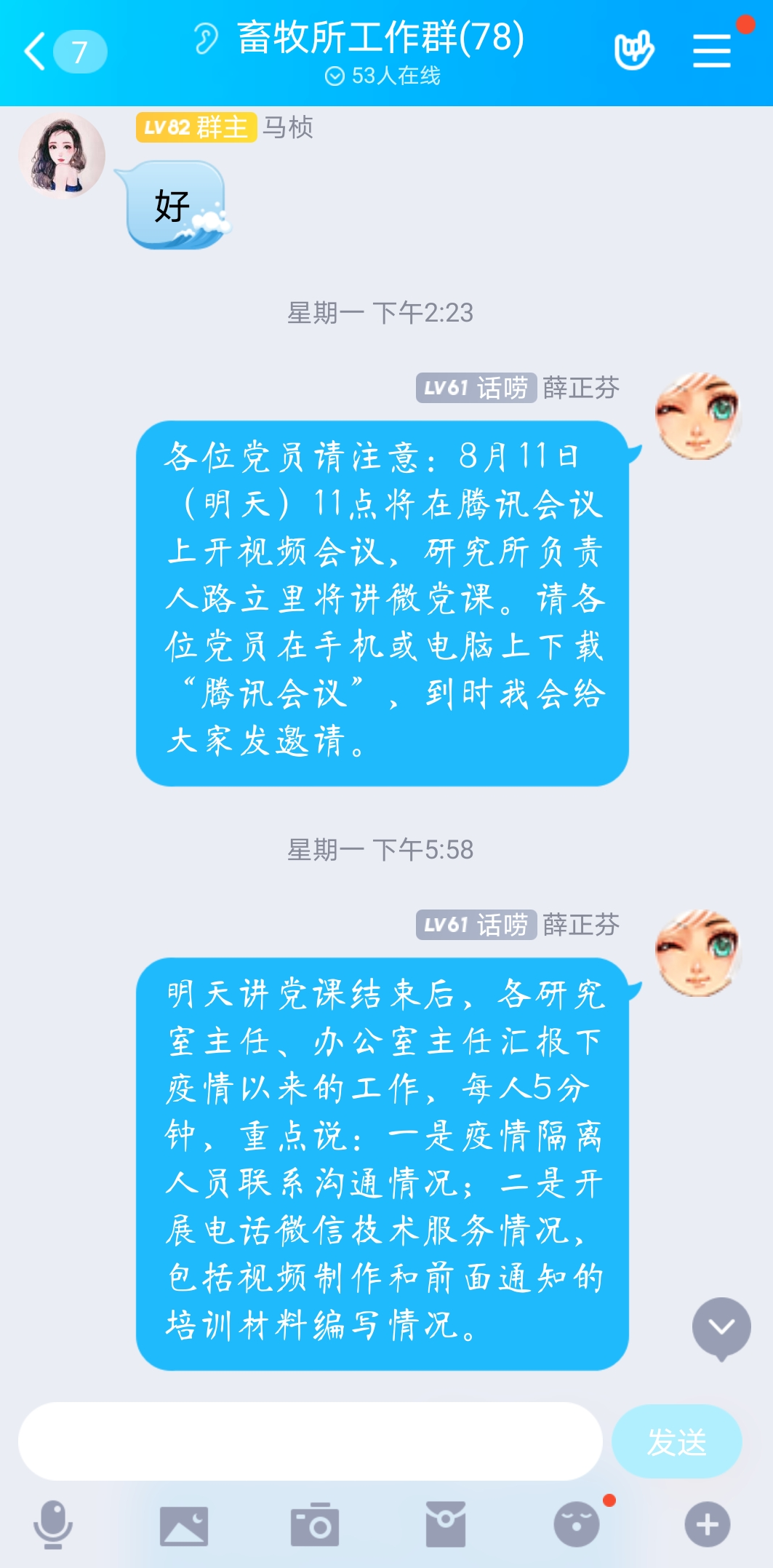 在乌鲁木齐市疫情期间,新疆畜牧科学院党委坚决贯彻自治区党委的决策部署,发挥党组织战斗堡垒作用,通过“互联网+党建”方式,将党建工作与疫情防控工作精密结合,同部署共落实。为确保疫情防控期间思想教育不放松,理论学习不断档。期间院属10个党支部组织开展了形式多样的“线上支部书记讲党课”活动。各党支部通过云视讯会议、学习强国视频会议、腾讯视频会议、钉钉视频会议、微信等多媒体平台开展线上讲“微党课”活动,做到紧扣主题、导向正确,将创新理论、大政方针与工作实际、身边典型相结合,发出好声音,传递正能量。