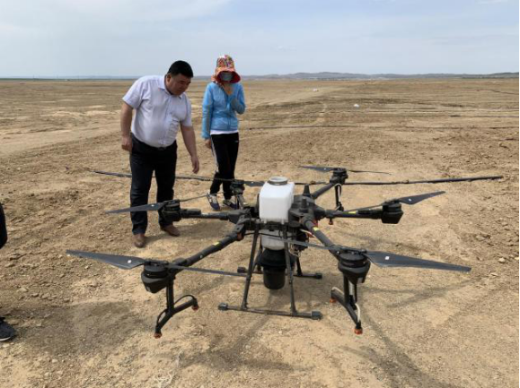 此次主要任务是与大疆植保无人机合作在项目种植示范区内飞播种植9种牧草,飞播牧草进行丸粒化后混合均匀,按2.5kg/亩播量进行飞播,总面积460亩。阿勒泰地区科技局乌兰副局长就项目开展相关事宜与侯钰荣博士交换意见建议,并对飞播技术进行现场指导。项目组成员按照项目任务计划,开展筛选草地群落优势组合和配置模式,布设36个小区,为下一步研究打下坚实的基础。