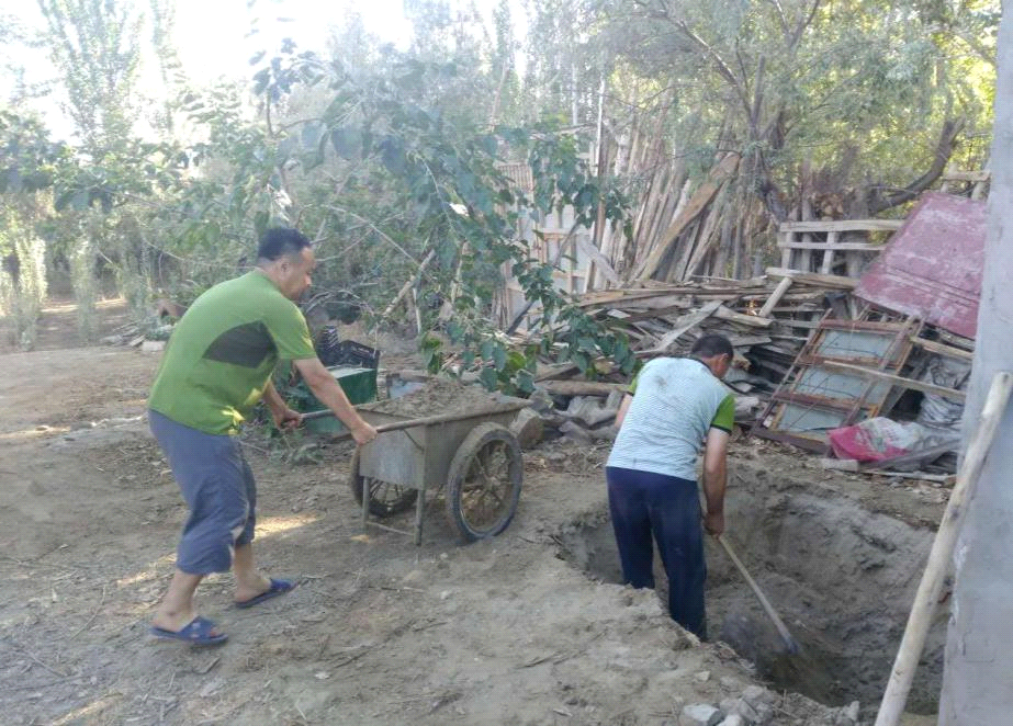 帮助包户家庭庭院建设。饲料所结亲干部走访15村包户家庭户米曼·吾拉依木家时,发现她家厕所还未修建完成,鉴于她家劳动力缺乏的情况,饲料所刘艳峰、郭同军等四位结亲干部和亲戚一起在近40度的高温下共同劳动近2个小时,帮亲戚挖好了厕所,获得了亲戚真心的感谢。