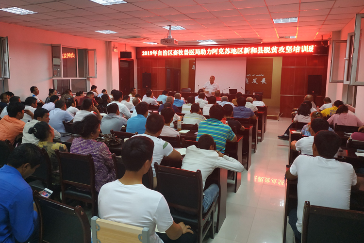 为进一步加强动物防疫和畜禽养殖实用技术培训,着力培养一支懂政策、技术强、善服务的村级动物防疫员队伍,增强养殖户做好动物防疫工作的主体责任意识,提高村级动物防疫员、养殖大户、企业合作社管理人员的畜禽养殖能力水平,应自治区畜牧兽医局委托,我院兽医研究所组织讲师团在阿克苏地区8个县市承办畜禽养殖“四良一规范”和“动物疫病防治实用技术”培训班。6月3日—8日,讲师团队分别在库车县和新和县各举办三天培训班,两县的村级防疫员、养殖户、合作社500余人参加了培训。