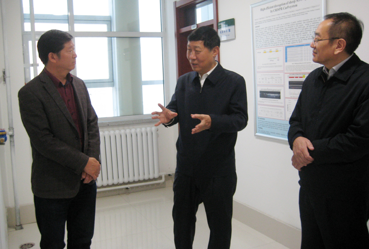 在生物技术研究所,纪峥部长听取了刘明军研究员团队在绵羊生物高新技术领域的科研工作介绍,尤其是在胚胎工程技术、转基因技术、基因编缉技术、基因聚合育种、基因组学等方面的创新研究和成果应用情况,在得知该团队应用现代生物技术手段在改良地方绵羊品种和培育肉用羊新品种应用研究上达到了国际先进水平,纪峥部长十分欣慰,饶有兴趣的与科研人员探讨了如何加快推进前沿生物技术研究突破,勉励大家要将这些先进技术手段与推进品种改良、促进产业快速发展和提高生产综合效益有机结合起来,尽快实现大面积推广应用,充分发挥出科技创新驱动引领新疆畜牧业上水平、提资增效的强大推动作用。纪峥部长十分关心人才工作情况,逐个向在场的科研骨干们详细询问了从事的研究方向、学习经历和工作感受,尤其是现有配备的科研力量是否满足科研创新的需要,详细了解了人才结构情况,叮嘱冯东河书记要充分发挥并强化研究所在人才引进和培养中的主导作用,制定梯次人才计划,着力完善政策措施,加强吸引、培养学科领军人才和青年科技骨干人才的工作力度,依托现有的省部级重点实验室等平台,突出人才机制创新和管理改革力度,努力营造出激发现有人才创业干事成事的良好发展环境。