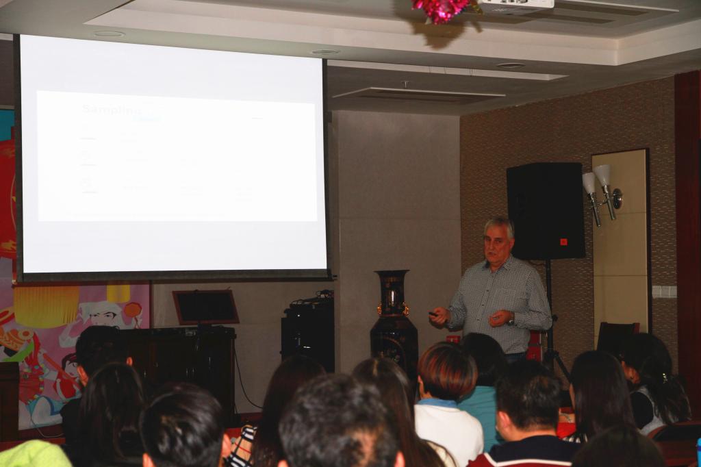 22日上午,在生物技术研究所,John教授与该所从事绵羊遗传育种研究的技术团队就目前正在开展的绵羊全基因组关联分析、基因组选择以及哈萨克羊遗传改良的实验设计、研究方案进行了深入详细的讨论,提出了具体的意见建议,明确了今后工作的研究目标和技术方案,对保障项目的顺利实施完成发挥了极大的指导作用。下午,John教授应邀在我院做了“Genomic selection for meat quality(绵羊肉质性状基因组选择)”,和“Rumen microbial profiling using genotyping