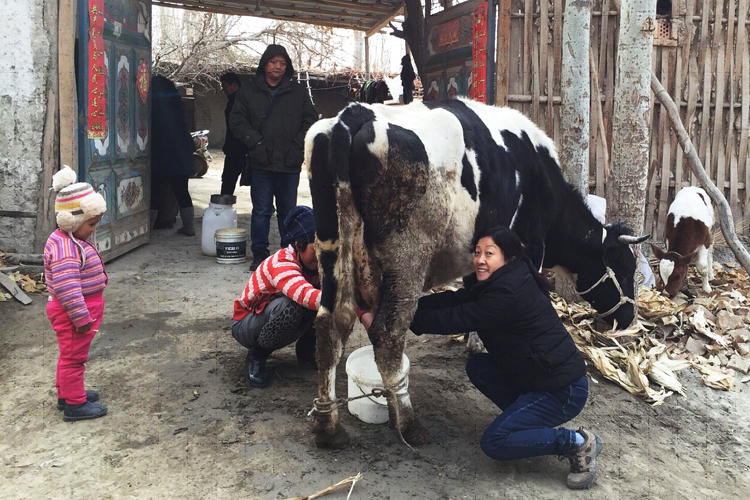 在开展“结亲周”活动中,专业技术人员发挥科技优势,关心群众疾苦,积极办实事好事,帮助群众解决困难。阿布都克力木·沙依木一家对畜科院队员们的到来非常高兴,在宣传党的十九大精神和土地承包政策再延续30年、抗震安居房等优惠政策过程中,阿布都克力木·沙依木表示感谢党的优惠政策,对全面脱贫致富、建设美丽乡村,全面奔小康很有信心。在交流过程中,我们的队员了解到阿布都克力木·沙依木家购买的荷斯坦奶牛下了头小牛,但由于之前没有饲喂过奶牛,对奶牛的饲养管理没有经验,希望能了解这方面的知识和技术。针对这种情况,畜科院科技人员发挥技术优势,手把手的从玉米、棉饼等精料的加工调制、玉米杆、麦秸和树叶等粗料的粉碎加工、冬季温水的饲喂、畜牧盐的自由补饲、定期驱虫和乳房炎的预防与防治、青贮饲料的储备和预混料的合理应用、饲喂和挤奶时间的合理安排等7个方面的奶牛饲养管理技术进行了现场示范和讲授,在同吃同住同劳动中把科学饲养知识传授给村民,为村民脱贫致富做好服务。