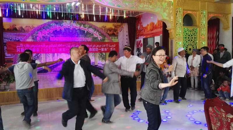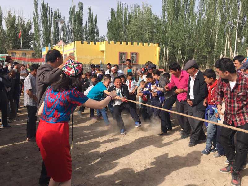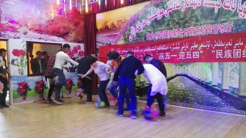 5日早晨抵达巴楚县色力布亚镇12村后,按照分组,由村民小组长带队,看望了各自的亲戚,分别给亲戚赠送了电烤箱、书包、糖果等物品。下午在村民宴会厅参加了12村组织的“庆五一、迎五四”“民族团结一家亲”活动。活动在青年团员宣誓中拉开了帷幕,驻村工作队队长、带队领导托乎提·阿及德书记、村民代表和结亲代表分别进行了如何正确引导青少年的价值观和青少年如何正确使用网络,以及从国外穆斯林作家的文学作品看稳定、教育、自由是多么可贵等方面的主题演讲进行发声亮剑,深入推进“去极端化”,坚决反对“三股势力”,维护民族团结,维护祖国统一,反对民族分裂。随后,结对子的人员和村民亲戚们一同进行了抢凳子,踩气球,麦西来普等民族团结一家亲活动,现场赢得阵阵掌声。本次活动在结对人员和村民亲戚共同举办的拔河比赛中落下帷幕。
