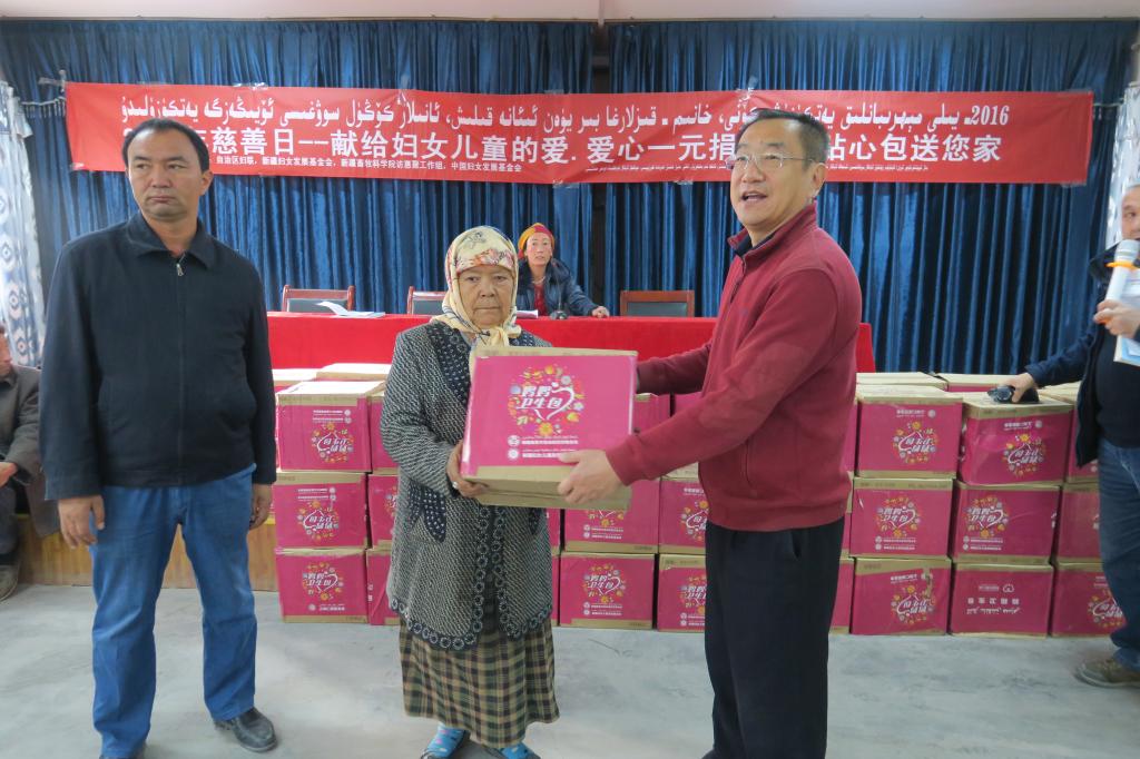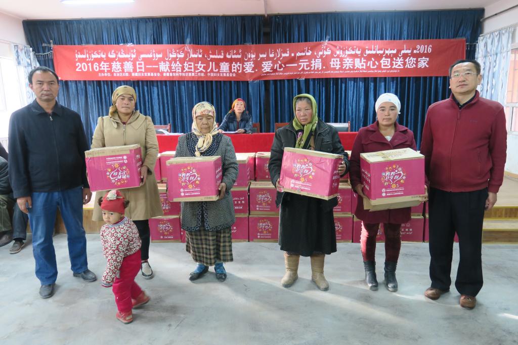 为进一步倡导社会各界关注访汇聚工作组贫困母亲,自治区妇联,新疆妇女儿童发展基金会联合新疆畜牧科学院“访汇聚”工作组,开展2016慈善日--“献给妇女儿童的爱·爱心一元捐,母亲贴心包送您家”活动。