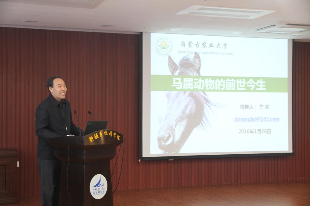 1月26日,应新疆畜牧科学院邀请,内蒙古农业大学副校长芒来教授来我院作了题为“马属动物的前世今生”的学术报告。报告会由李柱副院长主持,全院各研究所及新疆农业大学的科研人员聆听了报告。