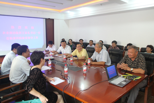 2015年8月11日,中国动物卫生与流行病学中心党组书记、副主任王宗礼,中国动物卫生与流行病学中心人事处处长梁洁一行来我院交流座谈。院党委书记冯东河、院长王力俭等院领导及院属各处、所领导参加了座谈会。