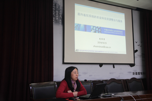 中国农科院农业信息研究所数字图书馆研究与建设部主任赵瑞雪研究员作“面向区域的农业科技信息资源整合与服务”报告