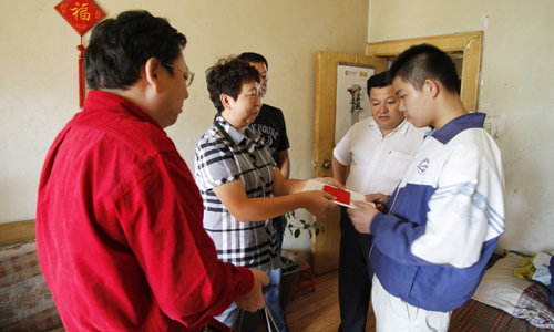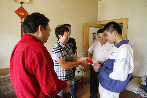 2012年9月14日中午,新疆畜牧科学院科技信息研究所党支部书记王锡波、所长李洁、副所长穆合塔尔等一行五人,来到乌鲁木齐市水磨沟区清泉社区,同社区领导、社区工作人员与畜科院下派清泉社区干部一起来到贫困家庭学生刘俊杰家中,探望、了解刘俊杰同学的学习、生活等方面情况并送上了500元爱心助学金与慰问品。