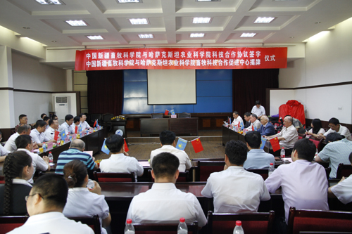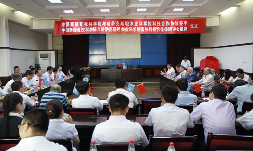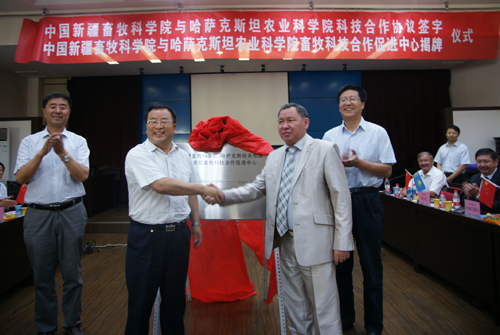 2012年8月10日上午,新疆畜牧科学院举行“中国新疆畜牧科学院与哈萨克斯坦农业科学院科技合作协议签字暨中国新疆畜牧科学院与哈萨克斯坦农业科学院畜牧科技合作促进中心”揭牌仪式。自治区科技厅国际合作处处长董平、畜科院党委书记何海源、院长王力俭、副院长巴合特别克、王长江、郑文新、首席科学家陈静波及院科管处、质检中心的领导和中心全体职工参加了揭牌仪式。