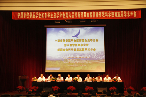 2012年7月28日,中国畜牧兽医学会家畜寄生虫学分会第六届常务理事会暨新疆畜牧科学院第五届学术年会在科技馆隆重召开。本次年会的主题是牛羊肉安全供给与畜牧科技发展。上午的会议开幕式由院党委书记何海源主持。中国农科院副院长李金祥,中国兽药监察所所长冯忠武,农业部动物疾病控制中心主任才学鹏,中国畜牧兽医学会家畜寄生虫学会理事长、中国农业大学动物医学院教授、中牧集团研究院院长汪明,自治区党委农办副主任汤国滨,自治区畜牧厅党组成员、首席兽医官孙浩,自治区畜牧厅党组成员、副厅长木日扎别克·木哈什,自治区科技厅农村处处 长黄娟出席。新疆畜牧科学院党委书记何海源、院长王力俭,副院长李柱、巴合特别克、王长江、郑文新、纪检书记张宏伟等领导和来自32所高校、科研单位的寄生虫理事会常务理事,地县畜牧兽医专业技术人员和我院全体科技人员计350余人参加。