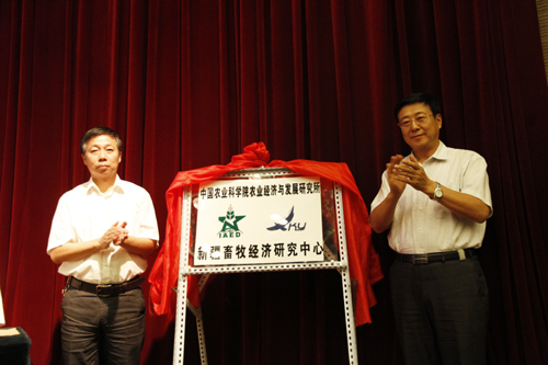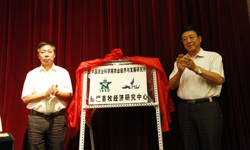中国农科院副院长李金祥和自治区党委农办副主任汤国滨共同为“中国农科院农业经济研究所新疆畜牧经济研究中心”揭牌