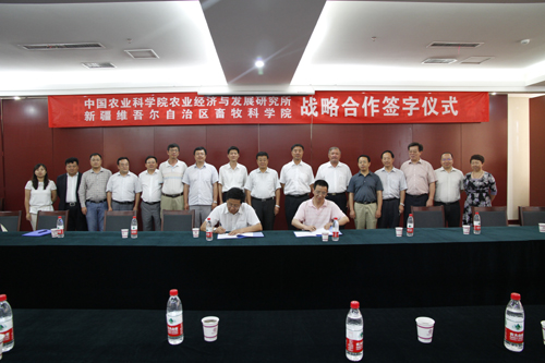 2012年7月28日,中国农业科学院农业经济与发展研究所与新疆畜牧科学院在自治区科技馆举行了战略合作协议签字仪式。中国农科院副院长李金祥和自治区党委农办副主任汤国滨共同为“中国农科院农业经济研究所新疆畜牧经济研究中心”揭牌。中国农科院副院长李金祥、科技局副局长陆建中、农业经济与发展研究所副所长王济民、刘世洪主任、王明利主任、杨春博士和我院党委书记何海源、院长王力俭、副院长巴合特别克、王长江、郑文新、纪检委书记张宏伟及院科管处、信息研究所领导和全所职工出席了签字仪式。