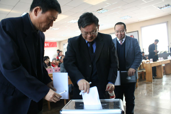 图为:院处级领导投递民主测评表