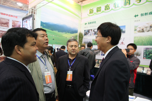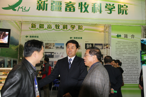 新疆畜牧科学院党委书记何海源与来访人员在我院展位前进行洽谈