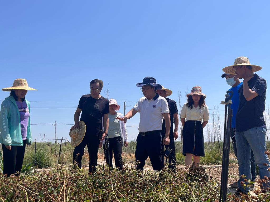 期间,李学森研究员首先向调研组一行介绍了近几年项目开展所取得的成效及本年度承担试验的进展情况。随后前往草田轮作试验区小黑麦制种试验田实地查看了今年小黑麦长势。烈日炎炎恰逢小黑麦收获,今年收获前夕突遇天气过程,部分小麦产区倒伏严重,但试验站小黑麦由于品种适应强,长势良好未受影响。在基地活体资源圃,调研组查看了资源圃建设情况,了解了保存资源的总体情况,并针对部分生产利用意义较大的种质资源提出了意见与建议。在32份苜蓿病虫草害试验区,李彦忠教授仔细查看了部分苜蓿品种发病情况,建议试验区继续保留,可为后续相关研究提供基础材料。张新全教授表示,禾本科的鸭茅、老芒麦和豆科的红三叶、白三叶都是特别优异的饲草资源,绢蒿和驼绒藜等旱生资源可应用于生态恢复中,这些资源都具有较好的开发利用前景。苜蓿、青贮玉米、燕麦是当前三大主要的秸秆饲料,试验的开展对推动畜牧业发展具有较好的指导意义。