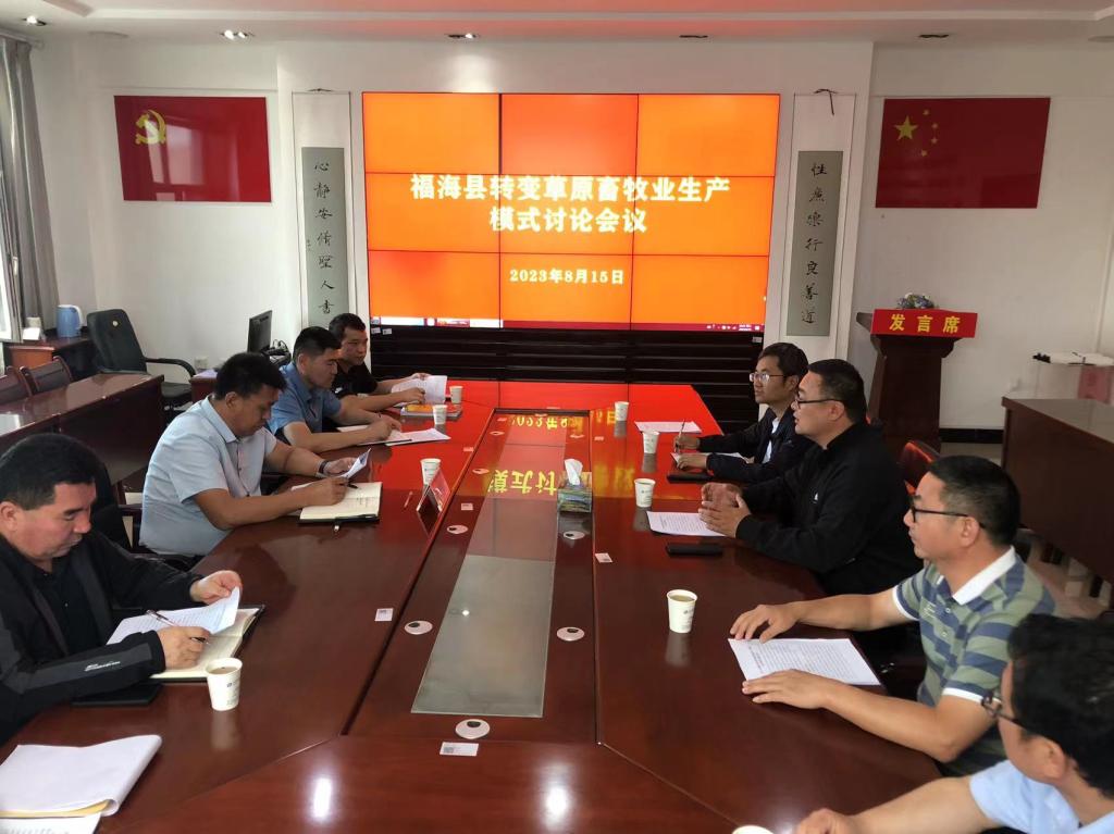 期间,专家团与福海县委分管领导和农业农村局、畜牧局相关负责同志进行座谈,讨论落实了福海县草原畜牧业转型方案,围绕智慧牧场建设、“定点轮”试点工作、动态载畜量测定等方面工作进行了深入交流。