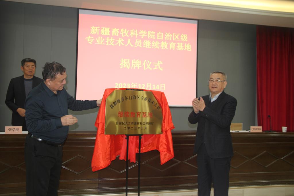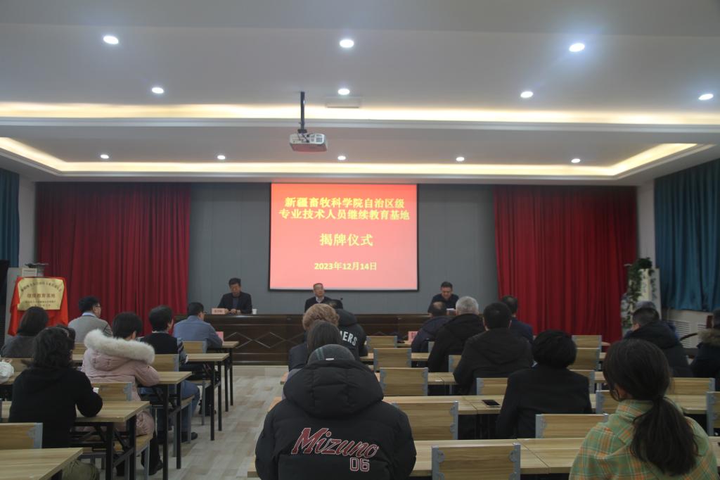 12月14日,我院自治区级专业技术人员继续教育基地揭牌仪式在沙依巴克区院区隆重举行,自治区畜牧兽医局党组成员,新疆畜牧科学院党委书记、副院长冯东河,新疆畜牧科学院党委委员、副院长巴哈提别克・阿哈泰为基地揭牌。院机关各处室有关领导、畜牧业经济与信息研究所主要领导及全体干部职工共同见证了这一荣耀时刻。揭牌仪式由畜牧业经济与信息研究所所长张学根主持。