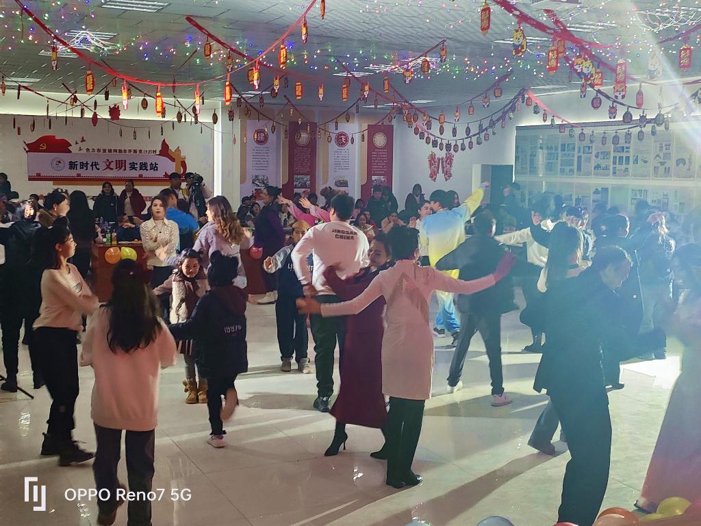 色力布亚镇党委副书记王俊同志代表镇党委、政府致辞,向大家一年来辛勤的工作付出表示感谢,并为群众送上新春祝福。晚会在阿勒台开斯克村居民带来的舞蹈《民族团结一家亲》中拉开帷幕,《美丽新疆》《为祖国喝彩》《有那么一个地方》等精彩节目轮番上演,赢得了现场观众的阵阵掌声。晚会在阿勒台开斯克村驻村工作队队长华实同志带来的歌曲《心醉》及队员演唱的《我的好兄弟》后达到高潮,村民们欢聚一堂跳起了热情洋溢的《麦西来普》,喜悦之情溢于言表,尽情抒发着节日的欢愉和对新年美好生活的向往,现场气氛充满欢乐和激情。