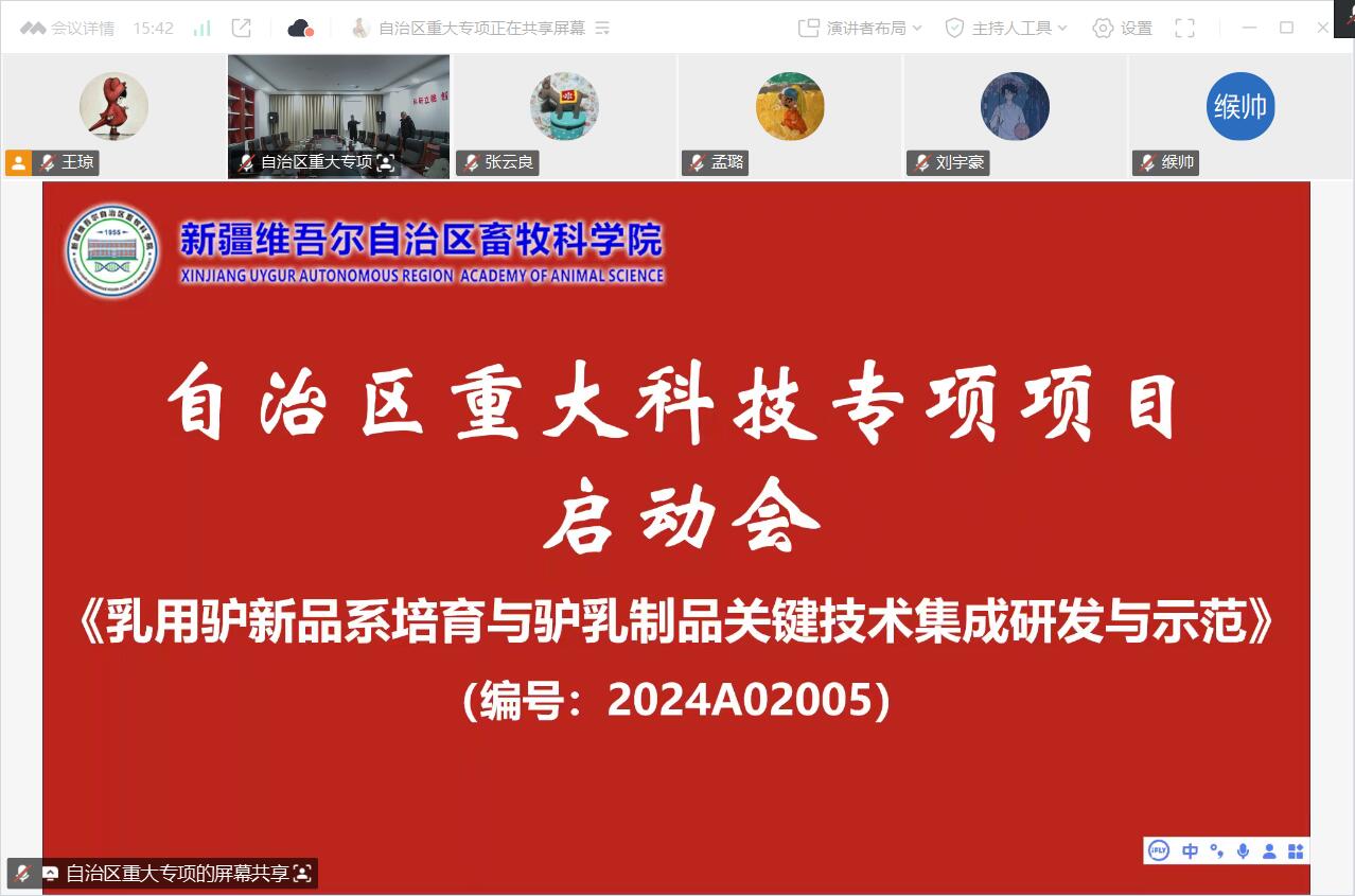 3月6日,由我院主持的自治区重大科技专项“乳用驴新品系培育与驴乳制品关键技术集成研发与示范”项目启动会在乌鲁木齐成功召开。会议由畜牧研究所副所长史洪才主持,采取线上线下同步的方式进行,自治区农业农村厅畜牧局二级调研员薛静、自治区科学技术厅农村技术处四级主任科员吴林蔚到会指导,院党委副书记、院长高宁讲话,院有关部门负责同志、项目主持人肖海霞研究员及项目参加单位代表共计82人参会。