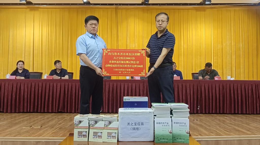 开班仪式上,王金泉院长对下沉巡回服务的实施方案进行了解读,并代表服务队向米东区捐赠了羔之宝疫苗、畜禽快速药敏检测试剂盒及动物疫病防控知识科普资料、《新疆肉羊产业发展研究》等书籍。他表示,米东区凭借其优越的区位优势和坚实的产业基础,在乌鲁木齐市的畜牧产业中占据着重要的地位,是首府名副其实的“肉案子”。相信在专家服务队和米东区人民政府的共同努力下,将会不断提升米东区畜牧兽医工作人员的专业技能和实操能力,提高农牧民的养殖水平,为米东区畜牧业高质量发展添砖加瓦。