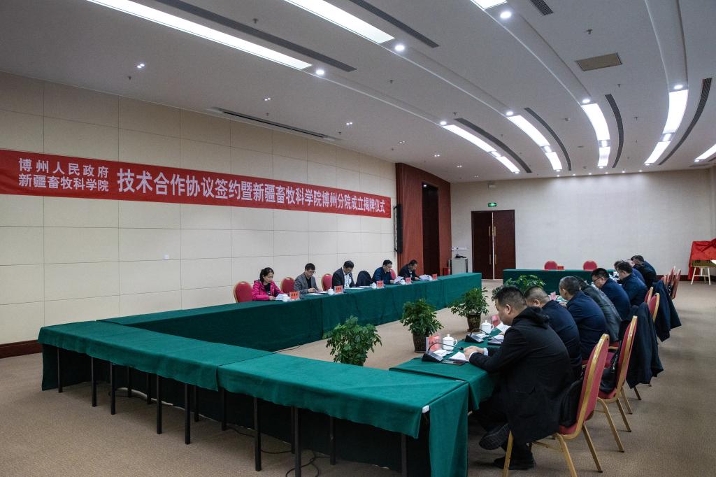 3月22日,新疆畜牧科学院与博州人民政府技术合作协议签约暨新疆畜牧科学院博州分院成立揭牌仪式在博尔塔拉会议中心举行。新疆畜牧科学院党委委员、副院长巴哈提别克·阿哈泰与博州人民政府副州长那·图新巴特签订了技术合作协议。新疆畜牧科学院党委副书记、院长郑文新与博州党委常委乌玛尔江·努合曼共同为新疆畜牧科学院博州分院揭牌。博州政协副主席程鹏出席会议。