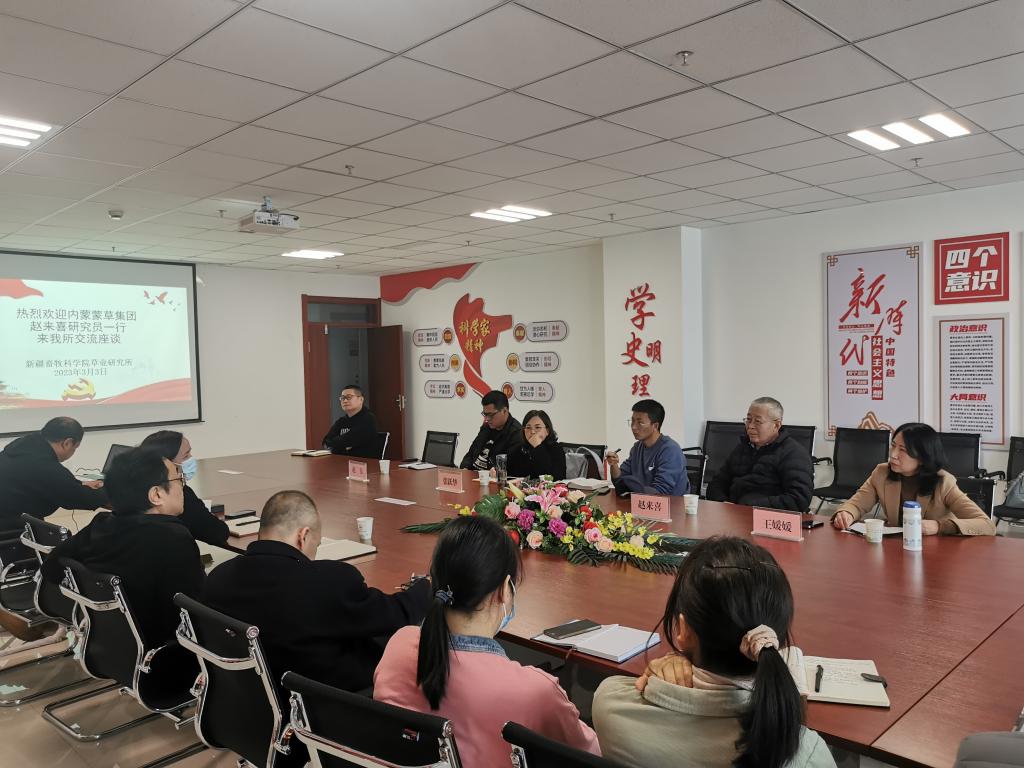3月3日,蒙草生态环境(集团)股份有限公司特聘专家赵来喜研究员、总经理王媛媛等一行5人来新疆畜牧科学院草业研究所就加强双方合作事宜进行交流座谈。草业研究所副所长蔺宏凯、阿斯娅·曼力克,研究员李学森及草种质资源、草地资源与生态监测研究室相关科研人员参加了座谈会议。