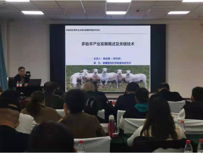 近日,应和田地区农业农村局邀请,自治区农区肉羊体系领衔专家杨会国研究员组织体系疫病防控岗夏俊、分子育种岗张云生、经济研究岗刘娜娜3位专家赴和田地区举办了“春季农牧业管理技术专题培训班”,专家从全疆多胎羊养殖概况及关键技术、多胎羊疫病防控技术、多胎基因检测及基因型选配、肉羊产业经济及融合发展等方面开展培训,培训专业技术干部56人,培训效果明显。