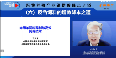 视频讲座由中国农业科学院饲料研究所二级研究员、反刍动物饲料创新团队首席科学家刁其玉主讲,介绍了近年来肉羊产业在饲养区域、饲养方式、饲养理念等方面的重要变革,针对反刍动物消化代谢特点以及研究水平,指出反刍动物对饲料能量和蛋白的转化效率还很低,强调肉羊的饲养不能像猪和家禽一样高精料饲喂,日粮中需要有一定比例的粗饲料,“养好瘤胃”是反刍动物饲养的关键。针对舍饲规模化养羊面临饲料成本占养殖成本60%以上的问题,建议采取以下策略应对:一是合理配制饲料,充分利用粗饲料资源,是羊只健康成长的保障;二是合理使用微生态制剂,提高育肥羊的效率;三是合理利用杂粕,减少饲料成本。同时,对舍饲肉羊饲料配制给出了指导性原则:一是舍饲羊只的育肥配方要满足饲料转化比高、效果快、时间短和少生病的要求;二是饲料配制关键要满足羊只的粗饲料需要,尽量利用农副产品和新型饲料资源,满足快速生长对营养素蛋白质、能量、矿物质的需要。要使用新型饲料添加剂;三是饲料配制时应选择适宜的肉用羊饲养标准。