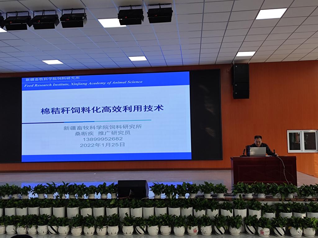 近日,受精河县农业农村局邀请,新疆畜牧科学院饲料研究所桑断疾研究员和郭同军研究员等一行3人参加了“精河县秸秆综合利用培训交流会”并授课。培训围绕“棉秸秆饲料化高效利用技术”和“饲料加工对饲料应用价值的影响”展开,分别就如何提高精粗饲料有效利用率、全价饲料科学合理搭配方法,棉秸秆药物残留,棉酚降解等内容,用大量图片和通俗易懂的语言进行讲解,并发放《棉副产品饲料化利用技术实用手册》30本。培训现场学员与专家交流互动,气氛活跃。