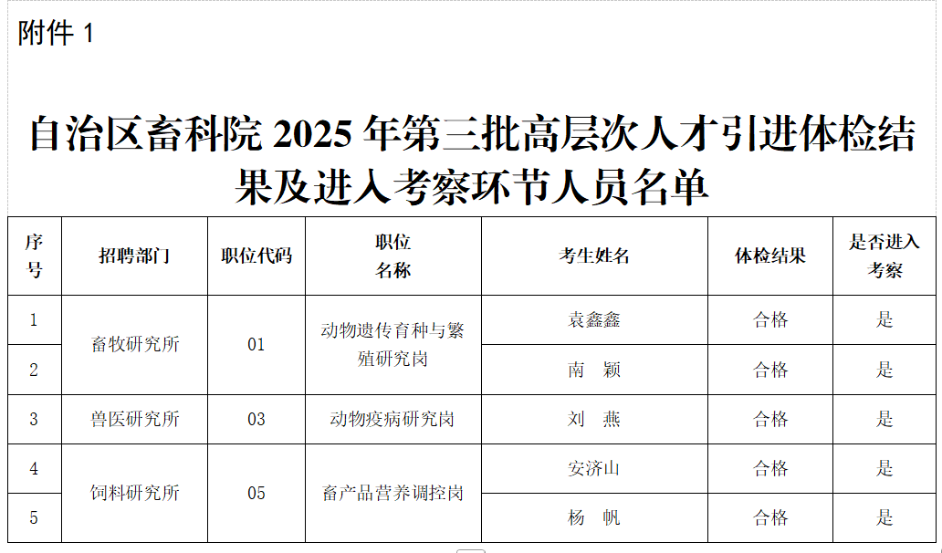 附件:1.自治区畜科院2025年第三批高层次人才引进体检结果及进入考察环节人员名单
