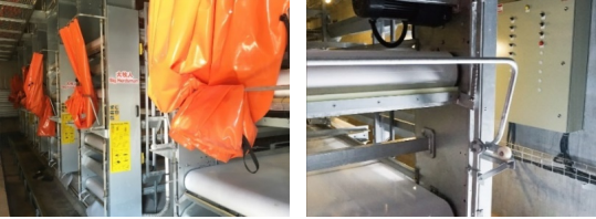 应采用传送带式清粪系统,包括纵向、横向、斜向清粪传送带、动力和控制系统(图5)。每层笼底均应配备传送带分层清理,由纵向传送带输送到鸡舍尾端,各层笼底传送带粪便经尾端刮板刮落后落入底部横向传送带,再经横向和斜向传送带输送至舍外,保证“粪不落地”,适当提高清粪频率,建议粪便日产日清。清粪传送带宜采用全新聚丙烯材料,具备防静电、抗老化、防跑偏功能。为避免鸡只接触清粪传送带粪便,应在每层笼上方设置顶网。