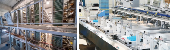 应采用自动化集蛋系统,包括集蛋带、集蛋机、中央输蛋线、蛋库和鸡蛋分级包装机(图6)。集蛋过程应将各层鸡蛋自动传送到鸡笼头架,进而通过中央集蛋线将鸡蛋从鸡舍集中传送到蛋库进行后续包装。包装过程应采用鸡蛋分级包装机进行自动鸡蛋分级、装盘,鸡蛋分级包装机效率需根据场区实际生产情况进行配置,通常处理速度为3-18万枚/小时。蛋带应采用PP5以上级别的高韧性全新聚丙烯材料。