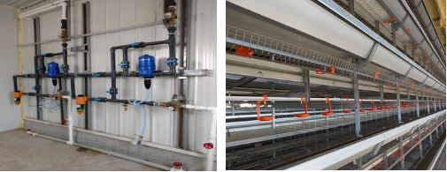 应采用乳头饮水线式自动饮水系统,包括饮水水管、饮水乳头、加药器、调压器、减压阀、反冲水线系统和智能控制系统(图4)。鸡舍水线进水处应设置加药器、过滤器,实现饮水过滤和自动化饮水加药。育雏育成前期,各层靠近笼顶网和料槽一侧,应设有高度可调节饮水管线,各笼布置2-3个乳头饮水器,在乳头饮水器下方安装水杯;育成后期和产蛋期,在中间隔网与顶网之间安装饮水管线和“V”型水槽,防止饮水漏至清粪带上。饮水管线等应采用耐腐蚀塑料材质。各层水线应设置水压调压器,保证各层水线前端和尾端充足供水。